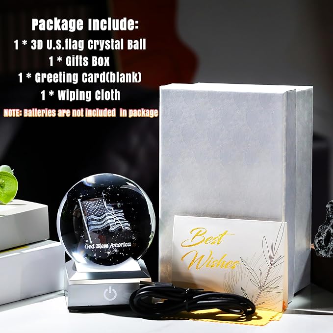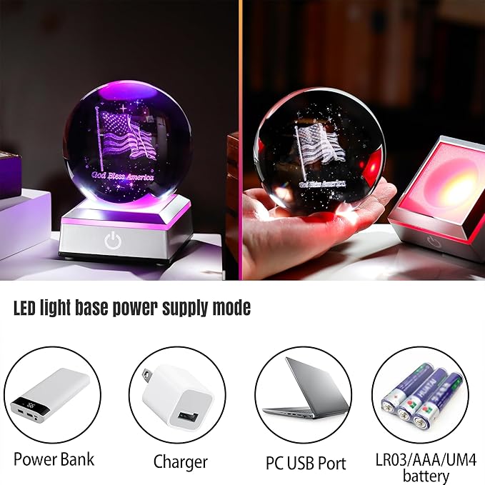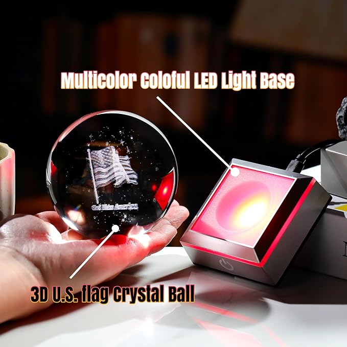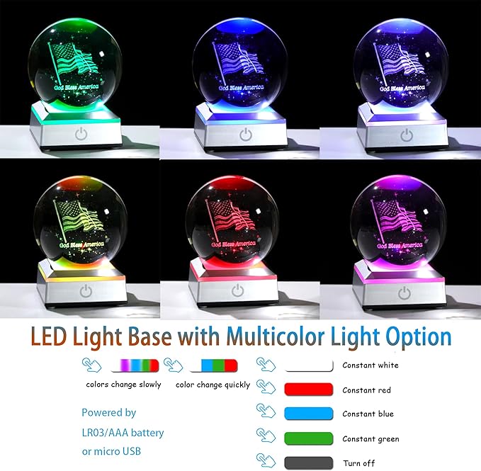 - Perfect Gifts for Patriotic: 3.15 inches crystal ball engraved america flag and "god bless america" text. This is a perfect souvenir for patriots on Independence Day, birthdays, christmas,New Year,Father's Day, and Mother's Day. The American flag and love for the country are forever preserved in the crystal ball. It is a perfect decoration under the colorful light base, symbolizing the patriots' eternal love for the country
