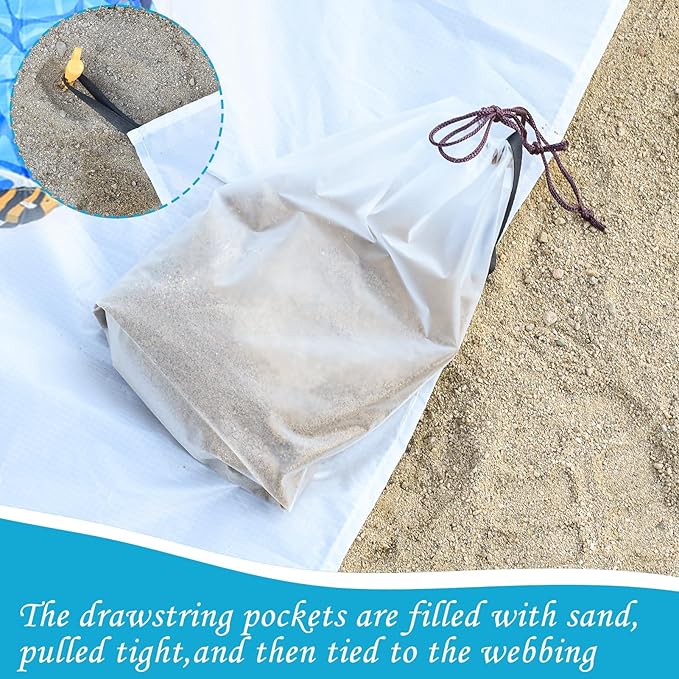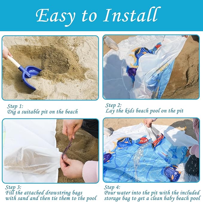 - Easy to Use: No air pump required! It's easy to create a clean and spacious pool for your child by simply digging a decent sized hole in the beach, placing the beach pool on top, and securing it by tying these drawstring bags filled with sand to the pool! Let your children play freely in the water without danger!