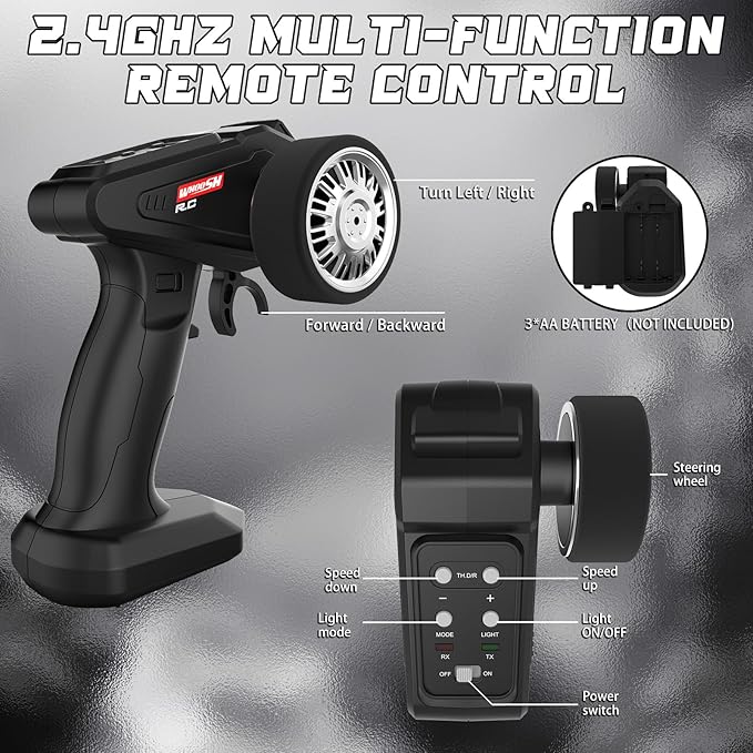- 2.4GHz Remote Control: Multiple people compete at the same time very stable, without being disturbed. It have a large control range, can controls turn left, right, forward and backward, lighting and speed adjustment. 3*AAA batteries are not included