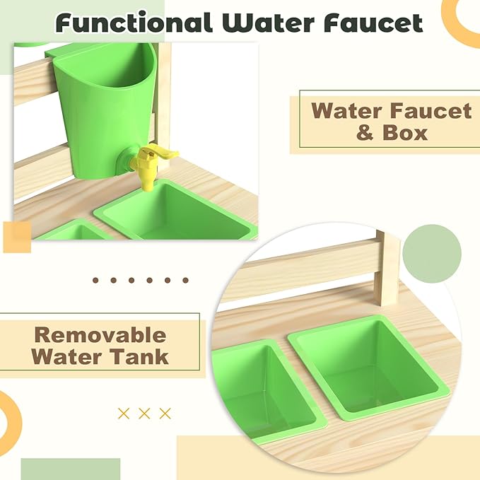 • Realistic Water Play: Includes a water tank with a plastic faucet, allowing kids to fill the tank and enjoy real water flow. Perfect for mixing mud or washing play fruits and vegetables, bringing a refreshing twist to outdoor play.
