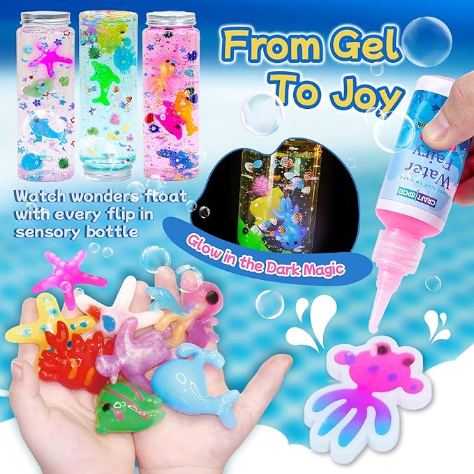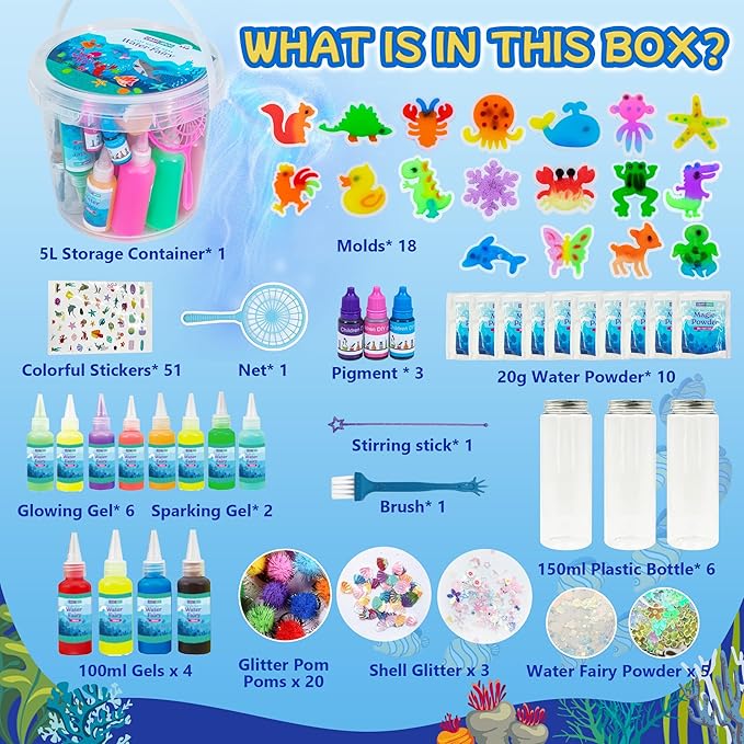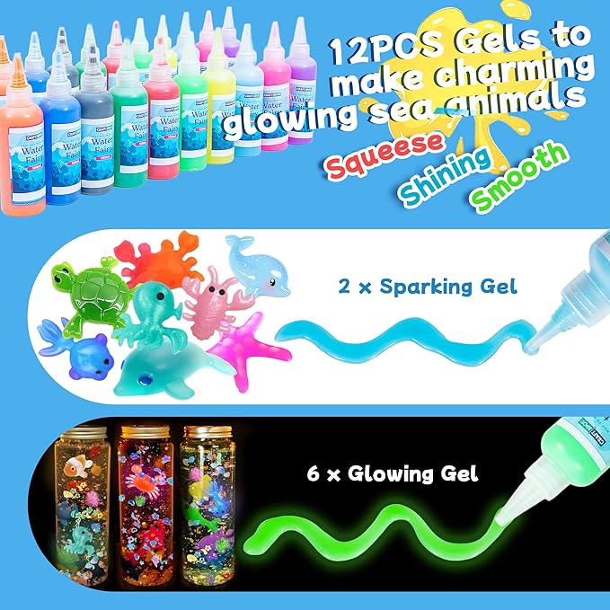 - Glow-in-the-Dark Fun: This kit includes everything you need for a magical experience, featuring 100ml x 4 pure color gels, 60ml x 6 glow gels, 60ml x 2 sparkling gels.Complete with 18 sea creature molds, a 5000ml bucket, sensory bottle (500ml), and a variety of accessories like colorful shells, shiny pompoms, glitter sequins, cartoon stickers and more