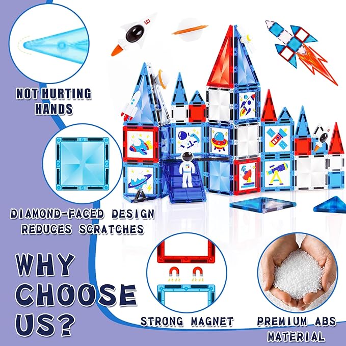 - 【58 Pcs Creative Space-loving Gift Ideas】 A diverse pack of magnetic tiles encourages creative imagination about a magical universe. This space playset comes with 39 pcs of diamond magnetic tiles in different shapes and sizes, an idea booklet, a storage bag, 5 magnetic figures of space theme, 8 interesting DIY window arts, and 6 colored pens. Get ready for your space adventure!