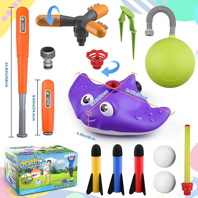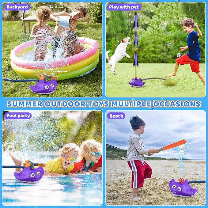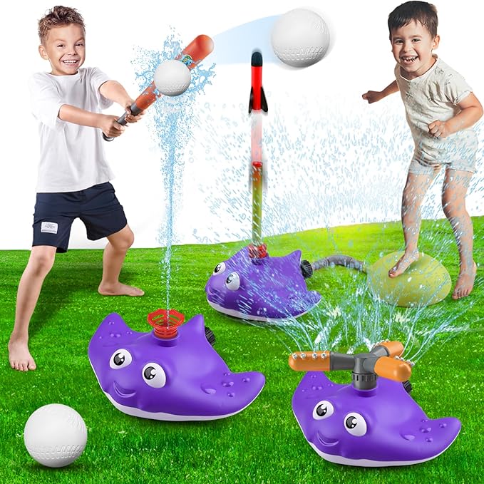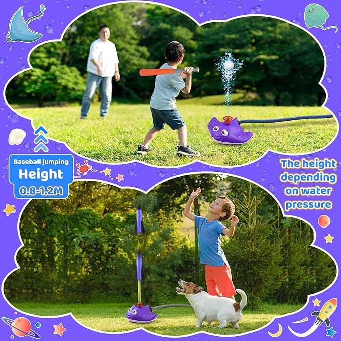- 【3 IN 1 Sprinkler for Kids & Outdoor Toddler Toys】Switch the nozzle heads to play water baseball or sprinkler easily: (1). 360° rotating kids sprinklers for yard water toys, with a wide spray area, play with water, water flowers, cool down, (2). As a baseball T-ball game for baseball training. (3). Stomp rocket. Depending on the water pressure, baseball water toy sprays water up to 0.8-1.2m(31.5-47.3inch). You can carry around for the coming summer days because of its compact and lightweight. Bring summer water fun for whole family, even your furry friends dog will love playing with it
