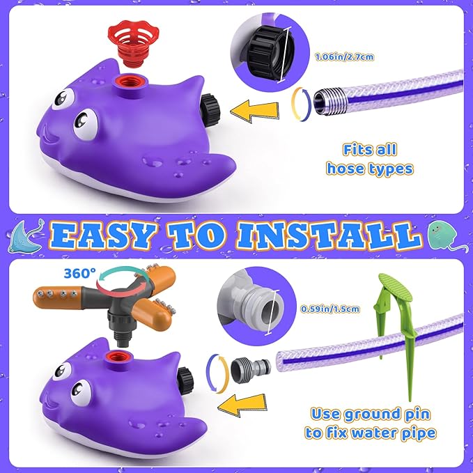 - 【Easy to Install and Play】There are two ways to connect this sprinkler water toy: one is to connect the nut (nut inner diameter 0.59in/1.5cm) directly to the threaded garden hose; the other is to connect the included connector to the nut, then connect the unthreaded hose (connector outer diameter 1.06in/2.7cm). Easily Adjust the baseball height and water sprinkling range by controlling the water flow from your garden faucet. The faster the water flow, the higher the baseball height of the spray, and the wider the range of the kids sprinkler spray