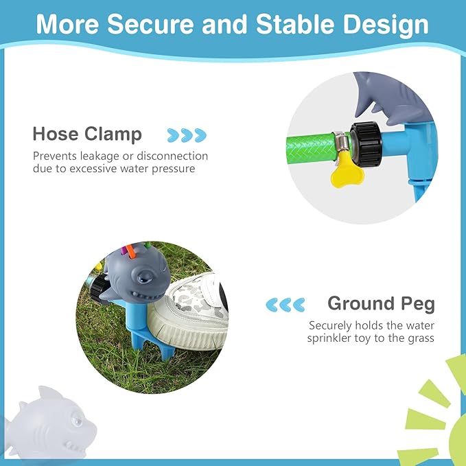 - Stable and Reliable: Splashing fun toys has a maximum water spray range of about 8 ft, and you don't have to worry about disconnection from excessive water pressure with a fixed hose clamp. With 2 clear rubber rings on the pipe interface, it is not easy to leak and burst even under high water pressure. Stable floor plugs hold the water spray toy firmly on the ground, allowing children to play safely.