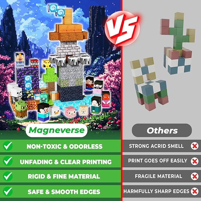 - 【Imaginaions & Creativity Builder】Let's embark on an adventure with building blocks! Spark the imagination of children with themes of lava, portal and forest. These blocks encourage open-ended play, allowing kids to construct, demolish, and rebuild as they please. Safe, durable, and designed for little hands, our cubes make learning fun, enhancing focus, patience, and motor skills—ideal toys for kids 3+ years old.