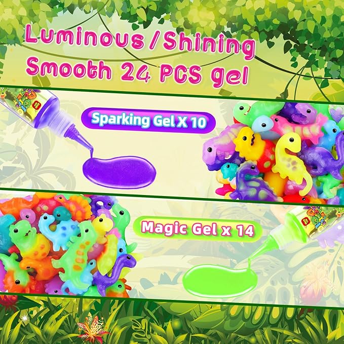 - Magic Water Elf Toy Kit: Equipped with 18 dinosaur molds, 14 colors of pure magic gel, 10 colors of sparkling magic gel, 6 packs of magic powder, homemade aquarium, instruction, disposable gloves, net, scale label, brush, complete and rich accessories, offering endless diy magic water elf combinations for creative fun.