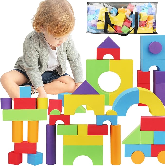 - Large Foam Building Blocks: This oversized soft block set includes 45 blocks of various shapes, colors, and sizes, along with an extra storage bag for easy cleanup, providing a unique opportunity to foster developmental skills in preschool children. These foam blocks are designed with a larger size, making them easy for small hands to grasp, promoting tactile engagement and sensory exploration – key elements in early childhood education