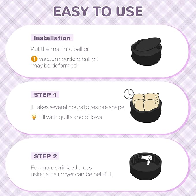 - 【Vacuum Seal Design】 The kiddie ball pit is vacuum-sealed. When you open the sponge, it will expand immediately, but it will not show a perfect circle immediately. It can be placed for 72 hours to wait for it to set. A hairdryer with moderate temperature or stuff the empty ball pit with pillows and blankets will help a lot to shape recovery