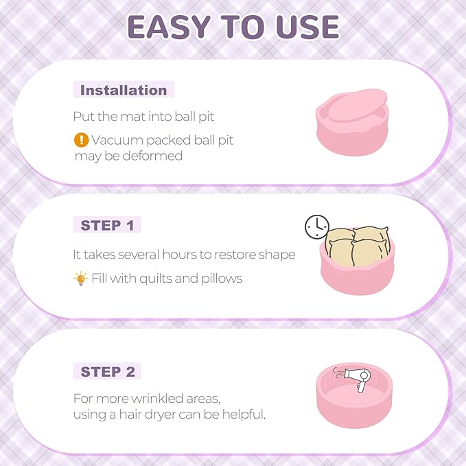 - 【Vacuum Seal Design】 The kiddie ball pit is vacuum-sealed. When you open the sponge, it will expand immediately, but it will not show a perfect circle immediately. It can be placed for 72 hours to wait for it to set. A hairdryer with moderate temperature or stuff the empty ball pit with pillows and blankets will help a lot to shape recovery