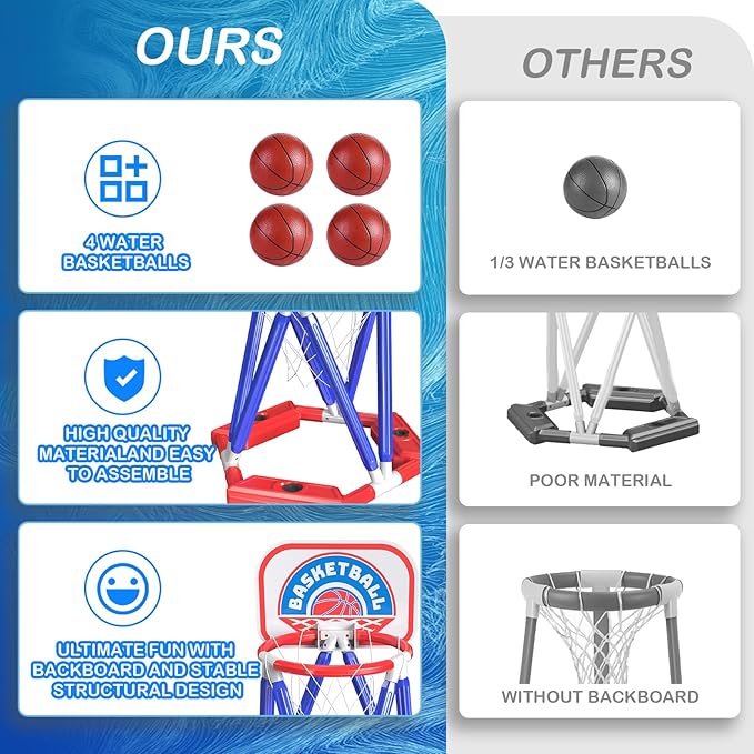 - COMES WITH 4 BASKETBALLS : Get ready for uninterrupted play with four reusable basketballs included; Crafted from BPA-free silicone, they're safe, reusable, and perfect for creating a splashy battleground.Their lightweight design makes them easy to tote, turning any spot into a laughter-filled water fight zone