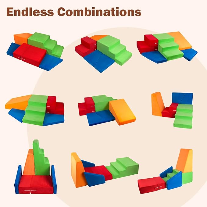 - TODDLER CLIMBING TOYS INDOOR FOR MOTOR SKILLS: These modular baby toys for 6-12 months and up can be rearranged into creative structures, encouraging toddlers to build, explore, and move. As a soft play climbing for toddlers, it supports gross motor development, balance, and coordination while keeping playtime fun and engaging.