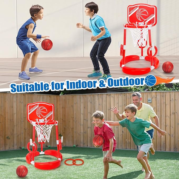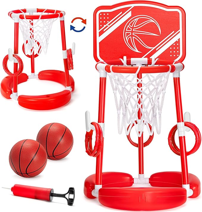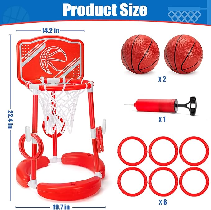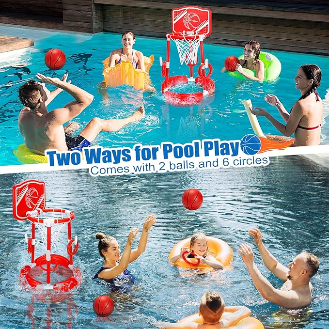 - Fun Pool Floats Toys Games Set:Enhance your poolside fun with our comprehensive kids basketball & ring toss Set, including 1 floating basketball hoop, 2 basketballs, 6 colorful rings ,1 basketball net and 1 pump. This upgraded 2 in 1 pool basketball hoop is suitable for multi people to enjoy two different exciting pool games,Kids can have passionate basketball water games and ring toss competition with their best friends and family in the swimming poolďźmaking an unforgettable summer.