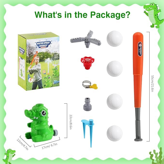 - Product Size and Parts List: Our toddler water toy measures 17cm×11cm×22cm/6.7in×4.3in×8.6in. The set contains sprinkler toy x 1, baseball bat x 1, baseball x 4, removable top nozzle x 2, hose hoop x 1, hose connector x 1. If you have any questions, please do not hesitate to reach out to us.