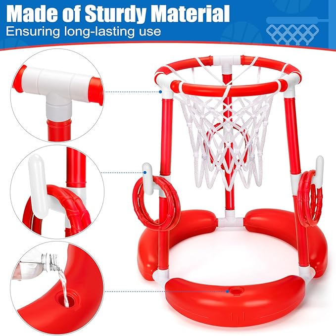 - Safe Material & Easy Assembly:Made from durable, non-toxic PE material, this mini pool basketball hoop wonât fade, crack, or release odorsâeven under the sun! Its triple-pillar base design ensures stable floating, while the water-fillable base adds extra weight to resist tipping in waves or windy conditions. Perfect for pool party games, it wonât leak during water basketball or ring toss, and stays like-new through repeated use!