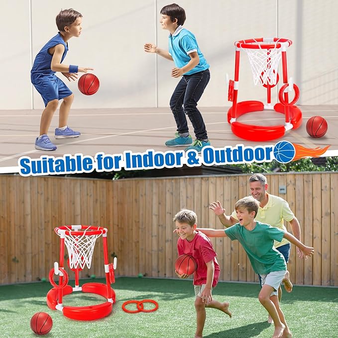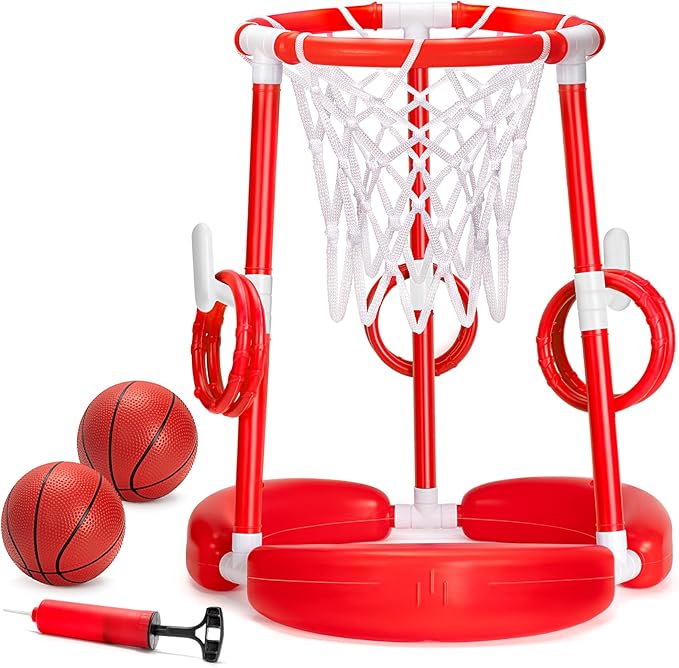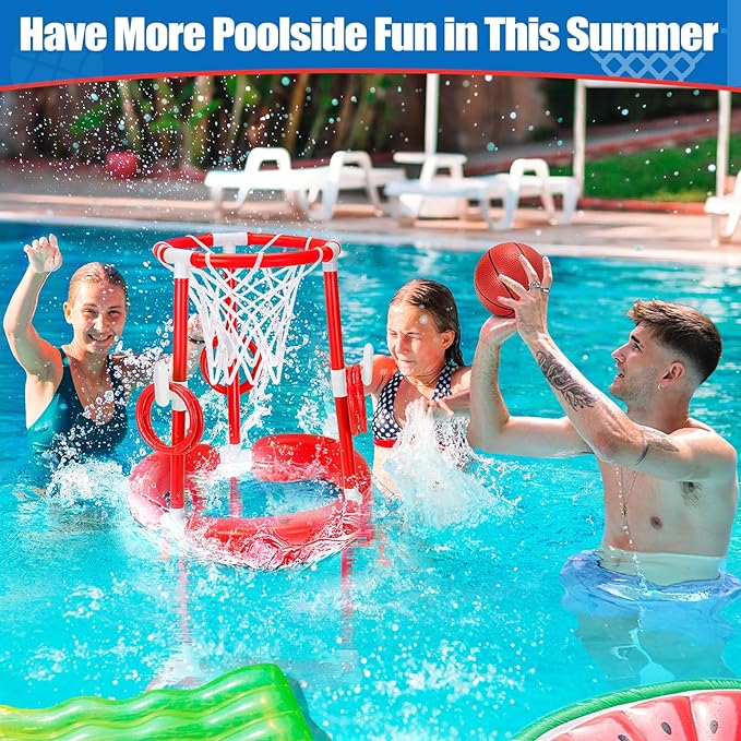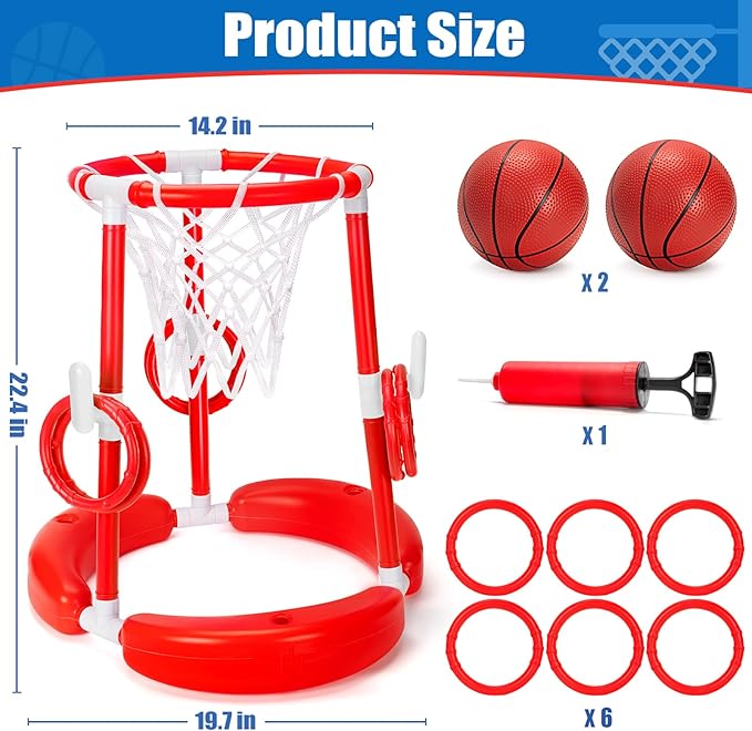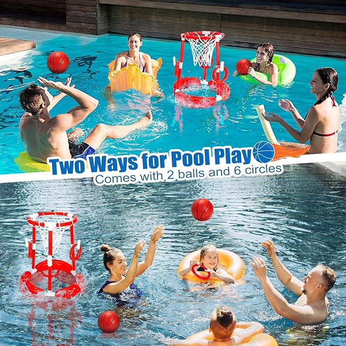 - Fun Pool Floats Toys Games Set:Enhance your poolside fun with our comprehensive kids basketball & ring toss Set, including 1 floating basketball hoop, 2 basketballs, 6 colorful rings ,1 basketball net and 1 pump. This upgraded 2 in 1 pool basketball hoop is suitable for multi people to enjoy two different exciting pool games,Kids can have passionate basketball water games and ring toss competition with their best friends and family in the swimming poolďźmaking an unforgettable summer.