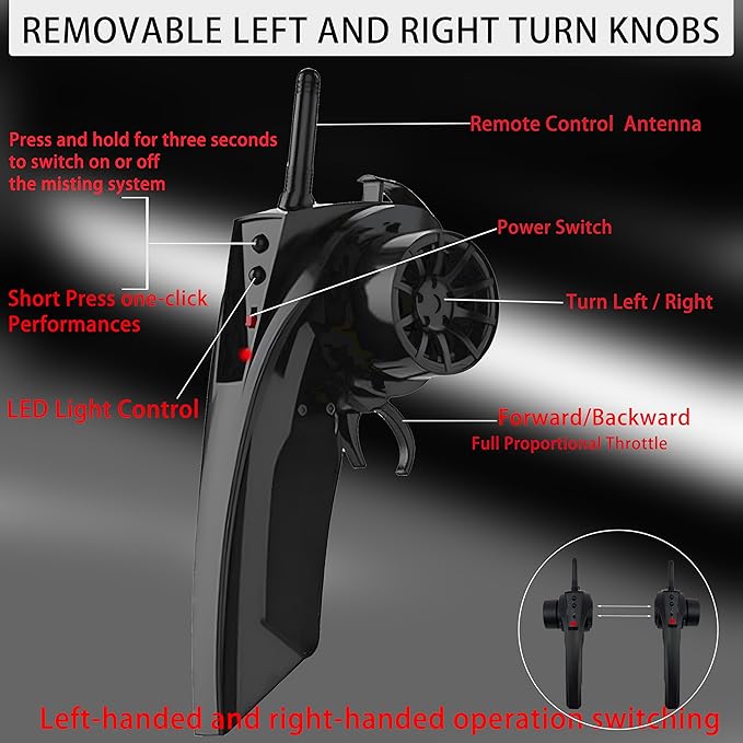 - LED LIGHTS AND SPRAYER: The HTURCCOP remote control car comes with a pair of LED headlamps rear tail lamps and LED sprayer lamps, as well as coloured chassis lights. When the RC car is powered on, the lights will flash. Turn on the water spray button on the remote control handle, the rear of the RC car will spray cool and gorgeous water mist, which makes the RC car more cool and exciting while driving.