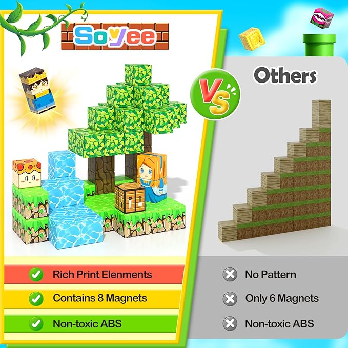 - 120PCS MAGNETIC BLOCKS, BUILD CONFIDENCE: Are you still worried about not having enough building blocks? The magent toy has a total of 120 pieces. Different from other simple elements, in addition to simple flowers, leaves, tree trunks, water, city walls, gold coins, etc., the toys also added new elements such as explosives, furnaces, beds, etc., so kids can have a deeper sense of substitution when playing with toys, and each element is marked with the quantity, so kids can build the shape they want, igniting their sense of accomplishment and self-confidence at any time