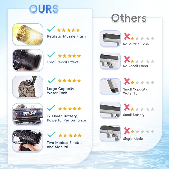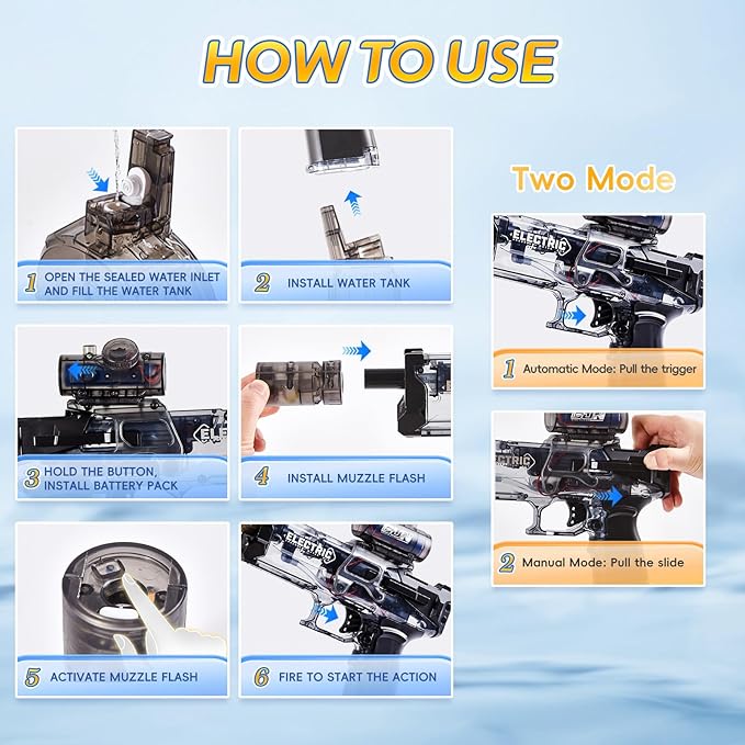 - [Dual Shooting Modes & Safe Play]Switch between electric and manual shooting modes for a versatile combat experience. Flashing lights and sound effects add an extra layer of fun, making this the ultimate summer party toy. Safety tested and quality assured, our water gun is designed for worry-free enjoyment—just avoid aiming at the face or eyes