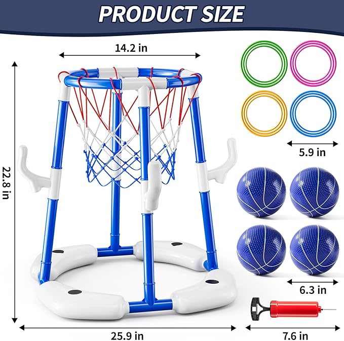 - Floating Basketball Hoop Set: The 2-in-1 pool basketball hoop(25.9*22.8 in) includes 1 floating basketball hoop, 4 basketballs, 4 tossing rings, 1 ball pump, 1 basketball net and 4 floating parts. Pool toys for kids ages 8-12 will bring fun during summer