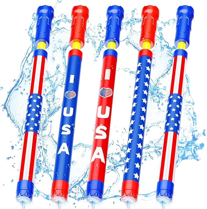 - Patriotic Elements Design & Safe, Sturdy: 6 Pack pool water gun feature a red, blue and white design and incorporates the American flag and star pattern making it colourful and vibrant. The patriotic water gun is made of sturdy materials that are resistant to damage and leaks. The 4th of july pool toys for kids features a comfortably designed handle with added friction, providing a comfortable and secure grip for fun in the sun!
