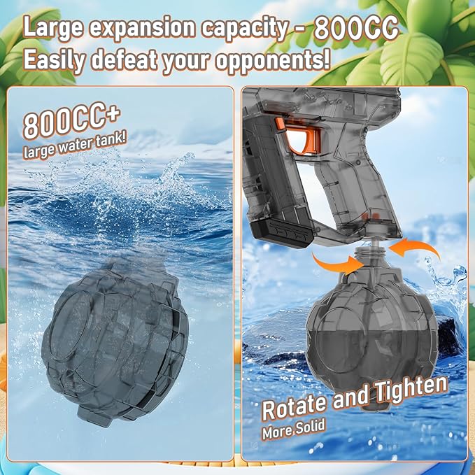 - ✅[Large-Capacity Water Storage Tank] The 800ml large-capacity water storage tank allows you to store a lot of water at a time. Whether it is a high-intensity water battle or a long-term game, you can enjoy uninterrupted water power.