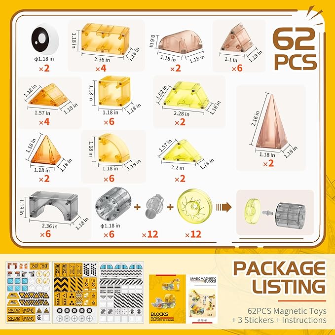 - More Imaginative - Our 3D magnetic blocks offer engineering stickers and eyes sets transform basic magnetic cubes into amazing construction vehicles, rockets, animals, or flowers. Children can fully unleash their creativity, watch cars become interesting roaring engineering vehicles through imaginative play.