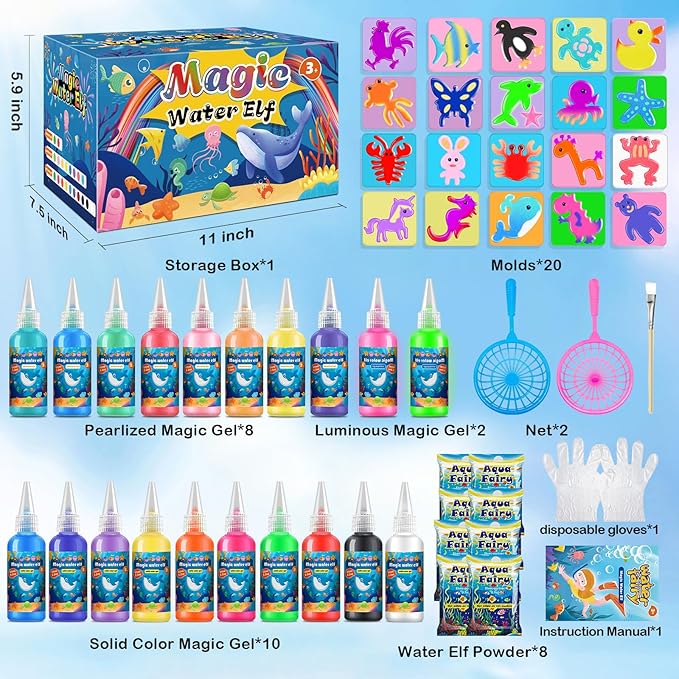 - WATER FAIRY GEL SET: The water elf toy kit includes 20 different molds, 10 normal colored gels, 8 pearl colored gels, 2 glow-in-the-dark colored gels, 8 packs of calcium lactate powder, homemade aquarium bottle, disposable gloves, strainer, brush and instructions. With 20 kinds of molds and 20 kinds of gels, it can meet your various matching needs.