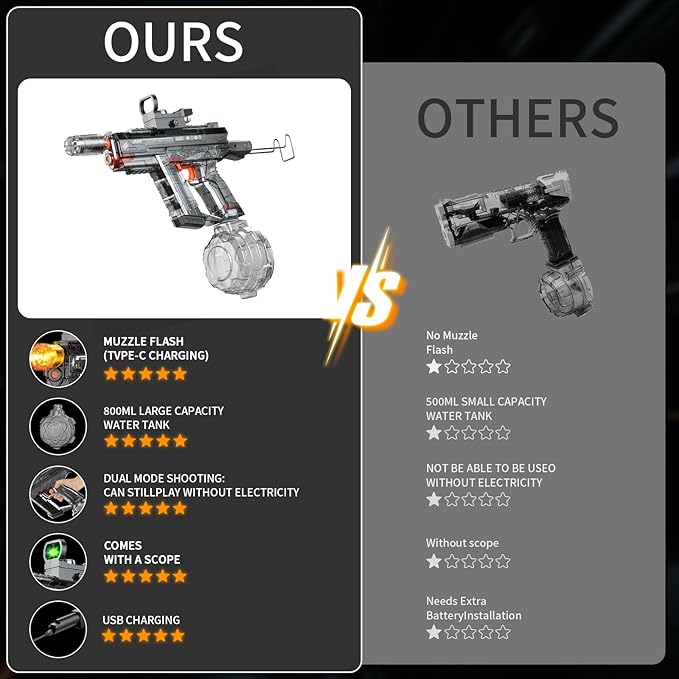 - Featuring both Dual Electric and Manual Modes:Engage the automatic mode and watch those water droplets fly with the speed of a thousand squirt guns! Or, if you’re in the mood to channel your inner marksman, switch to manual mode and take aim like a pro. Just remember, the ultimate goal is to soak your opponents—and let's be honest, yourself is a solid second!So, grab your water gun, load it up, and let the wet and wild adventures begin. Just don’t blame us when your neighbor starts plotting his own squirt gun revenge!