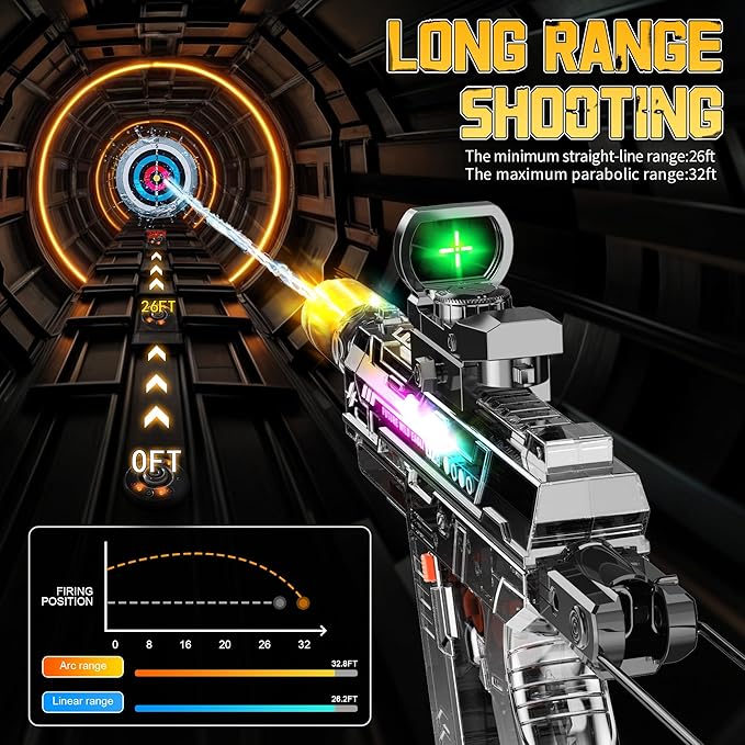 - Long shooting distance:Imagine this: you're on a sunny day, prowling the backyard like a stealthy ninja, and BOOM! You zap them with a straight-line range of 26 feet! And if you really want to reach for the stars (or just the next yard), our parabolic range takes it to a jaw-dropping 32 feet. Perfect for kids who want to reign supreme in their splash-tastic showdowns, teens looking for some serious summer shenanigans, or adults who just want a valid excuse to act like a kid again (we won’t tell!).