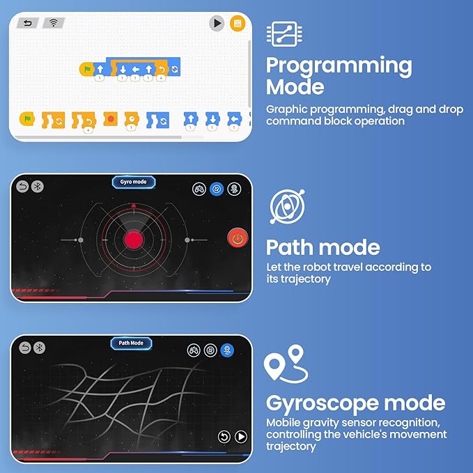 - Dual Remote Control Modes:Control your robot via remote or app with four exciting modes: Remote Control, Path Mode, Gravity Sensor, and Programming Control. Move in all directions—left, right, forward, backward, and 360° rotations—on smooth indoor or outdoor surfaces. Easy to use and packed with interactive features, it guarantees hours of engaging play.