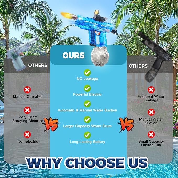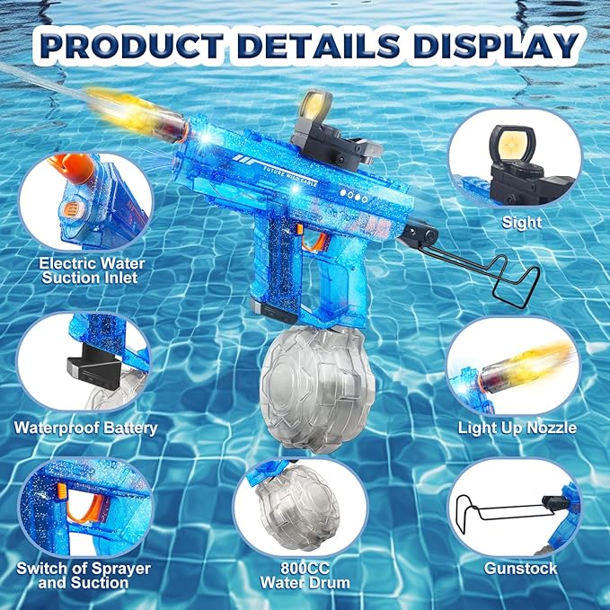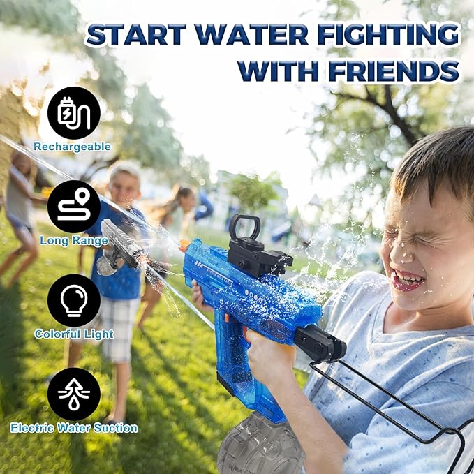 - Perfect Summer Gift: Electric water gun is a summer gift for children and a must-have prop for adults' beach parties. Water guns for adults are the perfect summer toy for swimming pools, beaches, water parties, and outdoor play. During the summer months, there's no better way to cool down than a water battle! With these automatic water guns, let the children indulge in the cool world of water