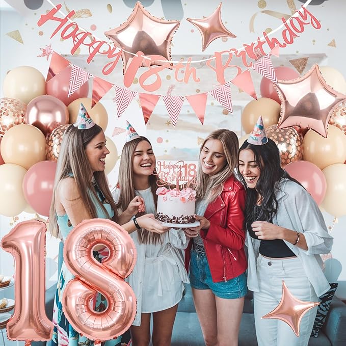 - Retro Pink 18th Birthday Decorations Girls: Includes 1pc rosegold happy 18th birthday banner, 1pc triangle flag bunting, 1pc 18 birthday cake decoration, 1pc 32in number 18 foil balloon, 4pcs star foil balloons, 10in (6pcs dusty pink, 6pcs sand white, 4pcs metallic rosegold, 6pcs neutral balloons), 5pcs 12in rose gold confetti helium balloons, and 1pc white ribbon