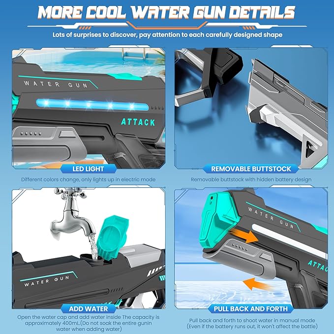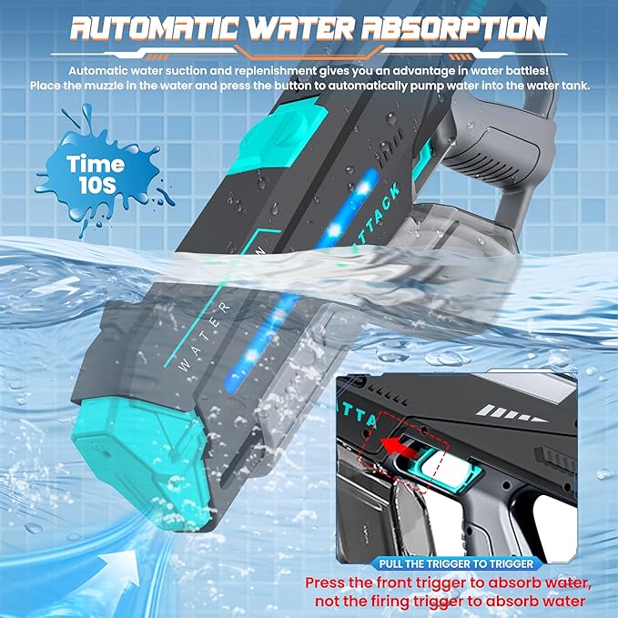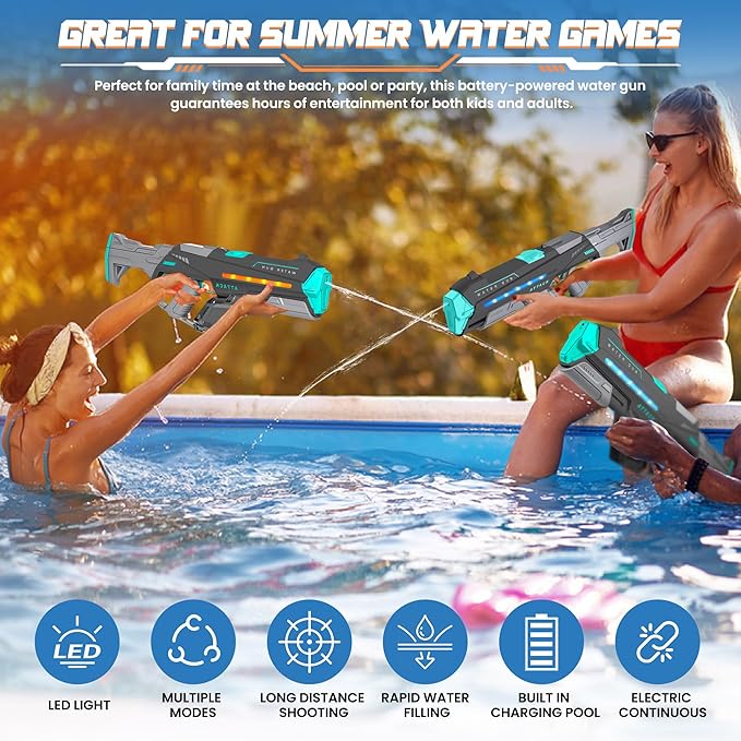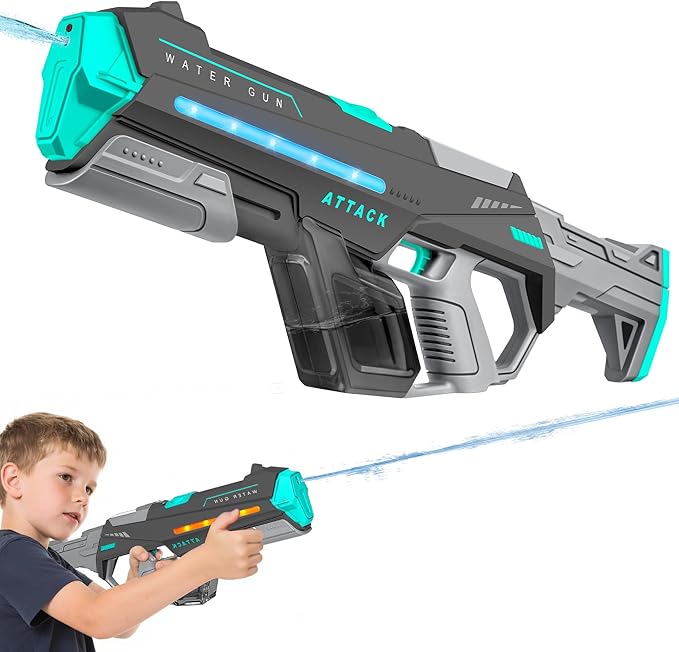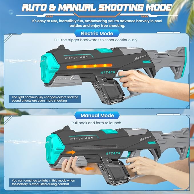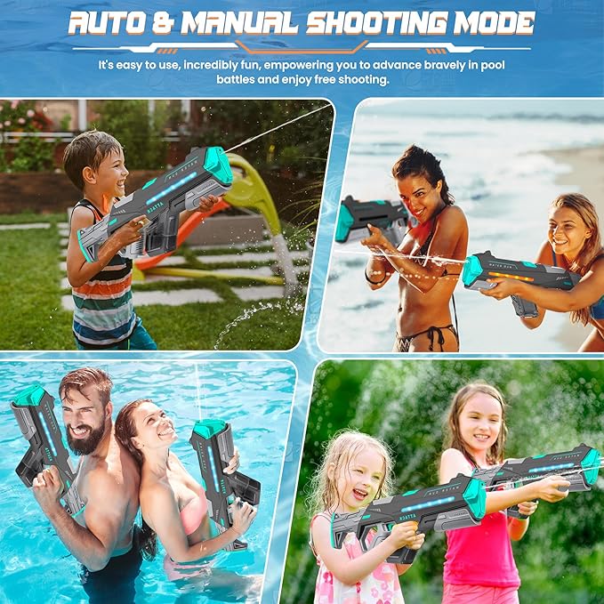 - ⚡ 【Dual-Power Dynamo】:Our water gun switch between electric auto-fire and manual pump-action modes for versatile play! Turbo-charged continuous spray or precision manual targeting adapts to kids’ fun and adult water battles. Perfect for pool parties, beach wars, or backyard showdowns – dominate every splash fight with adaptive firepower.