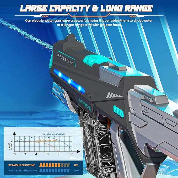- 🎯 【Sniper-Grade Range】:Super long range water gun, range of more than 32 feet! ! Laser-focused stream arcs for poolside targeting or outdoor team battles. Built-in LED light amps up night fights!