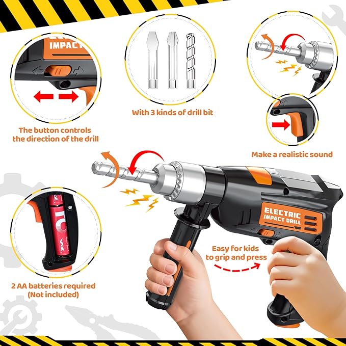 - 【Realistic Power Tool Drill Set for Kids】The kids real tool set comes with 3 interchangeable drill bits. Just install 2 AA batteries and it will make realistic drilling sounds and movements, which can attract kids and cultivate their imagination and creativity. Become a little engineer.
