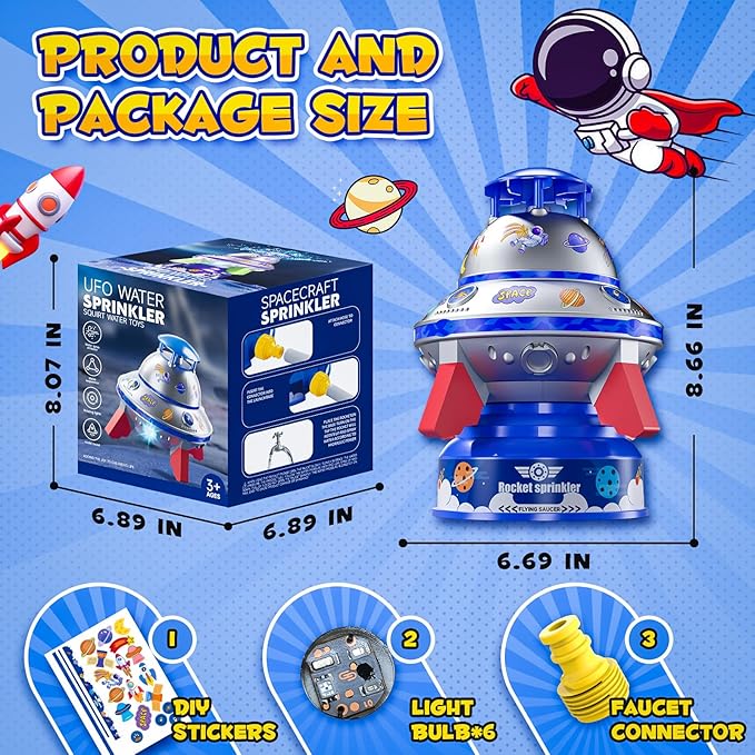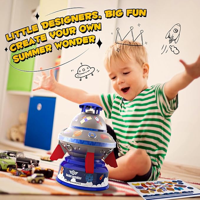 - 【Customize Your Sprinkler with DIY Stickers】Spark creativity with our customizable water sprinkler for kids! Each kids sprinkler comes with colorful stickers, allowing children to personalize their spacecraft. It’s a fantastic way for kids to express themselves and engage in hands-on play, enhancing their imagination and fine motor skills during those warm summer days.