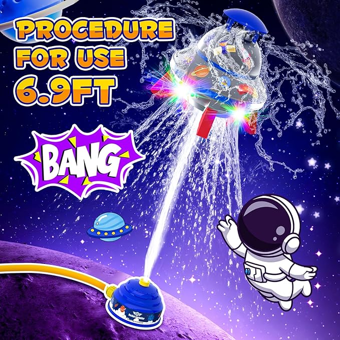 - 【New Upgrade Summer Water Sprinkler with Light Up】Dive into the ultimate summer adventure with this outdoor water toys for kids! This innovative water sprinkler toys equipped with lighting effects, lets children enjoy the thrill of a water rocket blasting off, making it the perfect addition to any backyard, pool party, or beach gathering. Your kids will love cooling off while the water rocket soars and spins, delivering refreshing fun on those hot summer days.