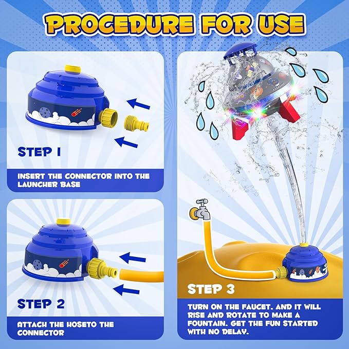 - 【Effortless Setup & Adjustable Height】Get ready to launch into fun with our easy-to-use kids water sprinkler! Just attach it to the garden hose, turn on the water, and watch as the water sprinkler toy powers up into the sky, spinning 360° to sprinkle water all around. It can reach a maximum height of 6.9 feet. The adjustable water flow lets you control the UFO sprinkler’s height, providing endless entertainment for the whole family.