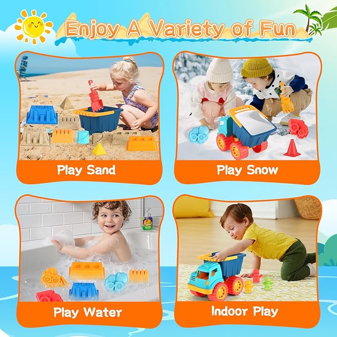 - 🚛 2-in-1 Dump Truck with Bucket - This kids beach toys comes with a large dump truck that turns into a removable sand bucket for individual use. Kids can pretend to be little construction workers - driving the truck to transport and dump sand to build a castle, or easily remove the bucket to scoop water or collect shells. This sand truck is a must-have for construction play on the beach, inspiring imagination and creativity