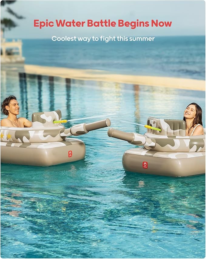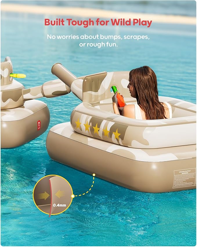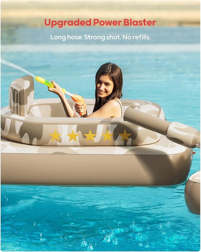 - Transform Your Pool into a Battlefield – Rule the water with this inflatable tank float, complete with built-in turret and splash shield. A bold addition to your collection of pool floats and pool toys—perfect for kids 6+ and adults seeking serious fun.