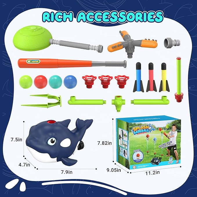 - Versatile Features: The whale sprinkler outside toy set comes with a variety of accessories: 1 whale sprinkler, 3 water column nozzles, 1 360° rotating nozzle, 1 retractable baseball bat, 4 baseballs, 1 ground stake, 3 rockets, and 1 air pump. The ample accessories ensure that kids have multiple play options.