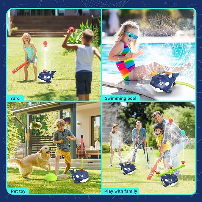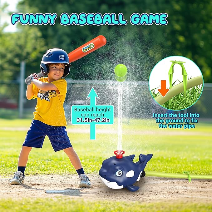 - Summer Outdoor Baseball Water Toy: This whale-shaped water sprinkler for kids transforms your yard into an ocean-themed baseball adventure, keeping kids active and cool all summer long. The baseball game allows kids to learn how to play baseball while developing their athletic skills. It helps improve their hitting abilities, hand-eye coordination, and accuracy, while stimulating both sides of their brain. The kids' sprinkler set with the baseball game can be used in the yard, on the grass, or by the pool, and is suitable for children aged 3 and up.