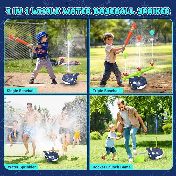 - 4-in-1 Sprinklers for Kid:Whale kid sprinkler has 4 funny ways to play: 1. Single-ball baseball, kids just need to aim and hit to have a perfect base hit. 2. Triple-ball baseball, with an upgraded difficulty, allows kids to use three baseballs at the same time to complete the baseball game. 3. 360° Sprayer, turn your yard into a spinning water wonderland! Kids will scream with joy as they dodge the swirling waves - the ultimate summer cool-down! 4. Rocket launcher, 3...2...1...lift off! Step on the launcher to send the rockets flying, then cheer as they land perfectly back on the ground!