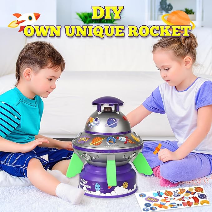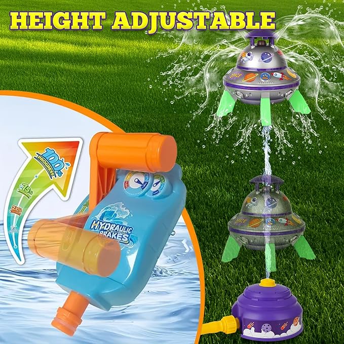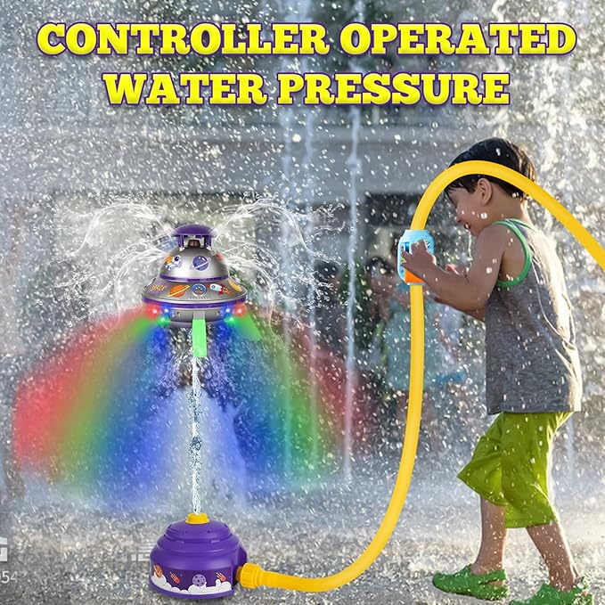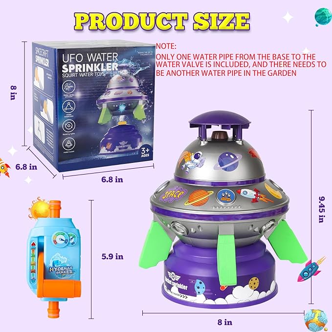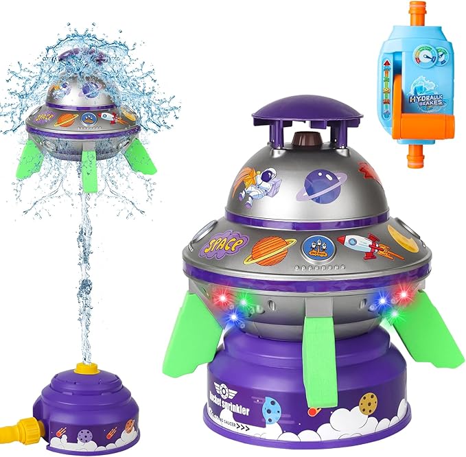- Customize Your flying saucer with DIY StickersďźSpark creativity with our customization water sprinkler for kids! Each kids sprinkler comes with colorful stickers, allowing children to personalize their spacecraft. Itâs a fantastic way for kids to express themselves and engage in hands-on play, enhancing their imagination and fine motor skills during those warm summer days.