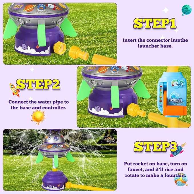 - Rocket Sprinkler With Water Valve: Compared with other products, we are equipped with a water pressure controller, which can better control the flight altitude of the product, (Flying too high can affect the stability of the water toys.It is recommended not to exceed a height of 6FT. )The kids sprinkler just needs to be connected to a usual garden hose and Water pressure controller, turn on the water tap, and the water sprinkler will be able to rotate 360° in the air, while the propeller rapidly spins to spray water.