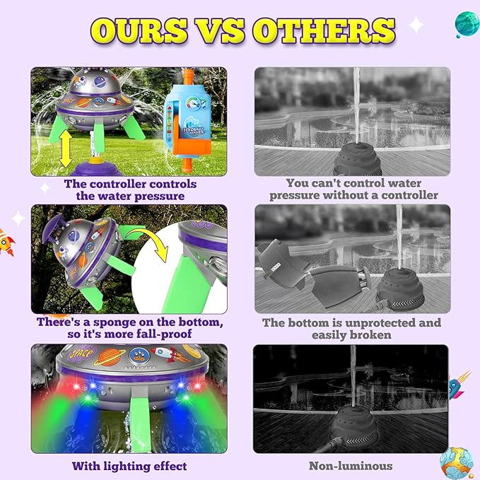 - Unique UFO Flying Saucer Design with Light-Up Effects: Our innovative sprinkler is shaped like a flying saucer, complete with flashing lights as it lifts off! It simulates a space capsule experience, creating an unforgettable summer adventure for kids and pets alike. Ideal for pool parties, beach days, or backyard fun.