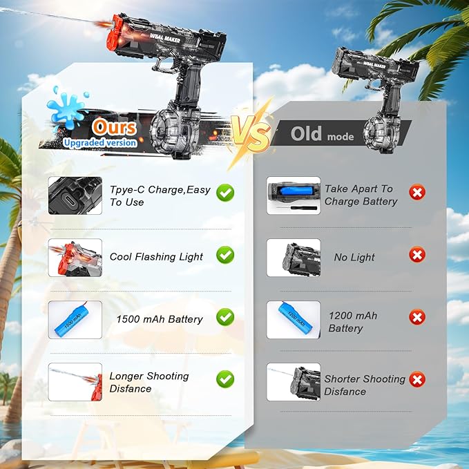 - 【Three Major Upgrades】Based on buyer feedback, this electric water gun has undergone its third upgrade in 2025, perfectly resolving previous issues. 1, Upgraded Charging:The old battery removal design is replaced with convenient Type-C charging. 2, Increased Cool LED Effects: A built-in LED light at the nozzle makes every shot more exciting. 3, Increased Battery Capacity: Upgraded from 1200mAh to 1500mAh, delivering longer playtime.