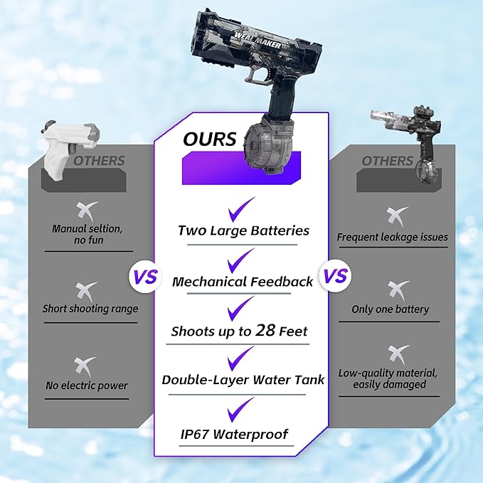 - 【Automatic Mechanical Action with Realistic Feel】Enjoy powerful, realistic firing with the automatic mechanical loading system. Feel every pull of the trigger with smooth and consistent water blasts.