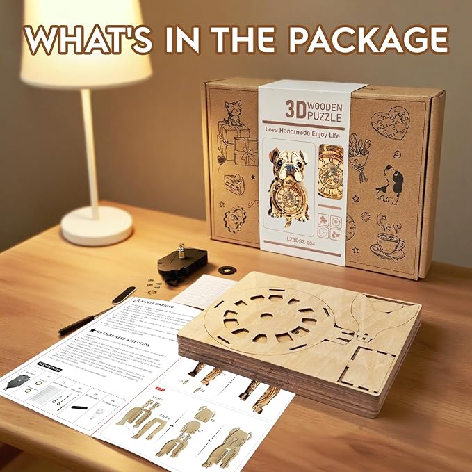 - 【Dog-Themed Mechanical Clock】This 3D puzzle clock crafted for DIY craft enthusiasts and dog lovers alike, this bulldog-designed 3D puzzle merges creativity with engineering. It features a swinging tail pendulum, offering a satisfying challenge for puzzles adult builders.